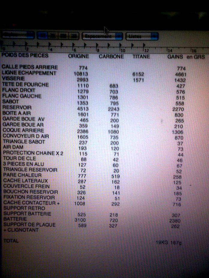 pour info j'ai encore quelles pieces dans les tuyaux pas encore monté mais environ 200 grs encore en moins j'ai besoin a mon tour de 2 infos poids étrier arriere avec plaquette poids amortisseur arriere si vous avez ces renseignement cela m'intéresse merci d'avance le poids maxi a gagné sur la F4 est 25 kg pour vous dire qu'il y a encore de la marge (d'aprés mes calculs et beaucoup de recherche) |