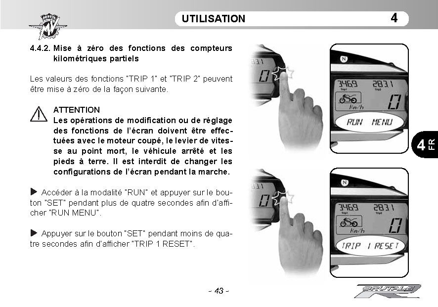 je mais au moins 4 minutes pour mettre le trip 1 à zéro en comptant comme un gland dans ma tête : ![]() " Appuyer sur le bouton “SET” pendant plus de quatre secondes" ( je compte 6 secondes) " Appuyer sur le bouton “SET” pendant moins de quatre secondes " ainsi de suite le plus dur c'est de s'en rappeler, sinon c'est mort....pour la remise a zéro ![]() ![]() enfin voila, je compatis pour les autres galériens possesseur de brutale. (pas de problème pour afficher le trip 1 ou (Trip 1 & Trip 2 ) |