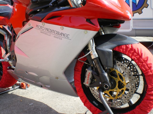 Je vis une aventure fantastique depuis 2 ans. j'ai fait la connaisance de C.RIZZOTTO et nous sommes devenus amis. Claudio était à la recherche d'un motard CRS ayant un niveau certain en SBK. je lui ai présenté Marc GRANIE, motocycliste à la CRS N°1 VELIZY en charge entre autre des escortes du chef de l'Etat. Au final, je vous laisse lire le mail que m'a adressé Claudio. Il m'a autorisé à le passer sur le forum. Je ne vous cache pas ma fierté d'avoir un peu contribué à la gloire de notre marque fétiche. Désormais, le plus gros du travail revient à Marco. Encouragez le car la tâche sera difficile mais pas impossible. Bonne route pap'nroll http://www.mvagustaforumfrance.com/f...1&d=1243450942 http://www.mvagustaforumfrance.com/f...1&d=1243451006 Chers Amis, Voilà c'est fait ..... Un grand Bonjour à tous les motards et passionnés de mécanique ultra. Cela a été pour moi un grand honneur, ainsi que pour mes camarades Angelo Merli et Valerio Amadio, d'avoir organisé et réalisé la moto dont Marc Granié rêvait et à Motoméditerranée Marseille / Nantes d'y avoir participé. Un petit rappel historique : Il y a presque 2 ans j'ai fait la rencontre de Marc Granié qui m'avait été fortement recommandé par Hervé Merlevede (que je remercie encore de l'excellent conseil). Marc Granié l'air tranquille est d'une grande courtoisie il n'en a pas moins un fort tempérament et un grand professionnalisme qu' aujourd'hui il met a disposition de MV Agusta dans une épreuve qui est certainement la plus extrême des courses : l'île de Man. Nous sommes tous avec lui ! Allez forza Marco ! Quelques détails techniques concernant la préparation de la moto, pardon de l'MV Agusta : il s'agit d'une 1000 R 312 pour la catégorie SBK Préparation moteur : - 4 bielles titanium - 4 pistons retravaillés avec un revêtement spécifique (pour des raisons de secret industriel je ne peux rentrer dans les détails) - culasse retravaillée à la main (savoir -faire maison) - soupapes titanium - ligne titanium - boite de vitesse à rapports rapprochés avec traitement spécifique - sélecteur de vitesse électronique (cela permet d'ouvrir la poignée des gas à fond sans débrayer et changer les vitesses) - embrayage anti dribbling (spécial course) - rupteur réglé à environ 15000 tours Pour ceux qui s'interrogent sur le coût d'une telle préparation moteur, le prix hors main d'oeuvre est d'environ 45.000 euros Partie cycle : - bras oscillant magnésium - platines latérales magnésium - T de fourche magnésium - Air Box carbone - carénage complet carbone - pare bouts avant et arrière carbone - protection de chaîne carbone - réservoir en acier majoré de 4 litres (étape obligée pour réussir à faire les 2 tours avant ravitaillement) - freinage Brembo monobloc SBK + réservoir liquide et pompe Brembo SBK - suspensions Marzocchi préparées spécifiques SBK (à l'avant) / point géré par Marc Granié directement - amortisseur arrière pneumatique (préparation Fornales Toulouse) / point géré par Marc Granié directement Coût hors main d'oeuvre environ 45.000 euros Câblage : - fabriqué sur mesure SBK Coût environ 2.000 euros Ce qui reste est d'origine. |