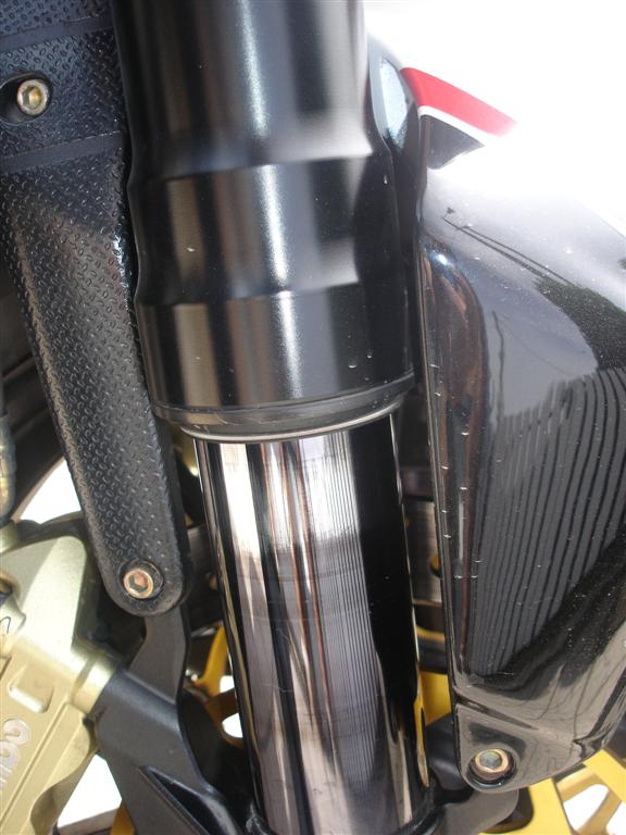 Et apparemment c'est un cas connu pour les 910R : le revêtement noir du bras de fourche s'use (d'ailleurs ça fait une bande couleur chrome au lieu d'être noire à l'endroit ou la fourche coulisse, voir la photo). et donc facture de 2700euros de pièces, mais je n'ai payé que l'heure de pose donc vive la garantie, et pour ceux qui remarquent cette usure, sachez que c'est pris en garantie même sans fuite! (c'est quand même pas normal pour du marzocchi, ne serait ce que pour l'estétique!)