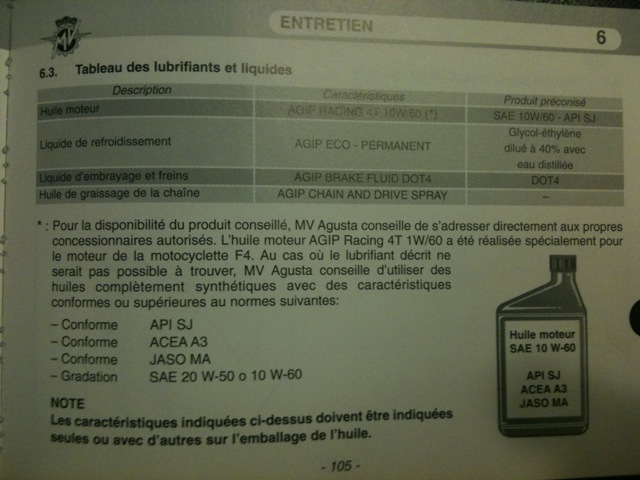 Et je songe à la reviser que puis je faire par moi même? vidange et filtre j'imagine? que dois je faire? que dois je mettre? type d'huile? on m'avait parlé de 10W60 je crois je sais plus!!! sinon, je pense qu'il y a une synchro injection à révoir, au ralenti à chaud comme à froid, le ralenti oscille de façon régulière en dessous des 1000tr puis remonte. C'est peut etre normal? ça ne l'empeche pas de bien tourner en tout cas.... Les bougies à changer peut etre Je n'ai aucun manuel, aucunes factures, le vendeur devait me les envoyer, et comme par hasard la poste aurait perdu le courrier!!! bref, n'hésitez pas, tous les conseils que vous pourrez me donner sont bons à prendre.... je sais faire pas mal de chose car j'ai déjà monté de A à Z 1 ou 2 motos, mais ce n'était pas MV ni de l'italienne.... je ne voudrais pas faire n'importe quoi non plus |
