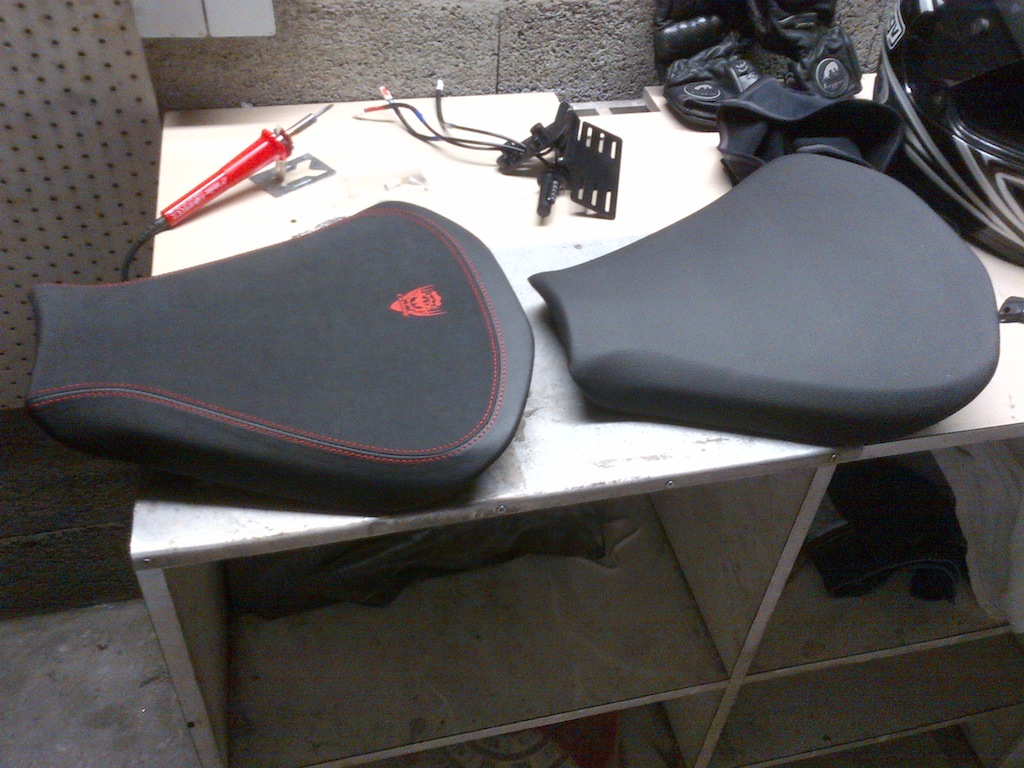 D'ailleurs voici la page du manuel d'atelier, section C. Y a cette vue plus une phrase bateau avec une photo ou on voit pas grand chose... La selle a une encoche femelle sur l'avant, et une patte de fixation percee pour une vis quart de tour sur l'arriere (avec une petite rondelle noire dessous la patte!). On commence par ouvrir la selle passager. Sur l'avant du compartiment il y a une grosse vis noire avec un anneau noir. On dévisse un quart de tour (bonne visu de la position angulaire de la vis grâce a la grosse encoche plate sur le dessus de la vis). La vis est a présent remontee de quelques mm et a du jeu. Ensuite on tire d'un coup sec vers le haut grace a l'anneau. Attention la main va forcement se cogner sur une partie metallique, ca peut faire mal ![]() Il y a cette petite rondelle noire coincée entre la patte de la selle et la moto. En tirant sur la vis elle peut s'envoler donc etre vigilant ![]() Ensuite on pousse la selle vers l'avant fermement avec une main de chaque cote pour la désengager de l'encoche. La selle est enlevée et on découvre des autocollants dont un avec la date de fabrication et/ou contrôle de la pièce! Bonne idée de la date d'assemble de sa moto, a quelques semaines près suivant les stocks de pièces détachées. Voici les deux selles: origine et la mv corse en couleur noire. Rassurez vous, il n'y a pas de soudure a faire! Y a plus qu'a remonter le nouvelle selle en refermant la selle passager, puis positionner la petite rondelle noire au dessus du trou de la vis. Ce trou a deux ergots qui vont guider et puis verrouiller la vis quart de tour. Ensuite poser la selle conducteur sur son assise légèrement en avant, appuyer dessus et en même temps vers l'arriere avec une main de chaque cote. Attention a ne pas faire bouger la petite rondelle pour la vis. Apres on regarde la patte de la selle pour positionner son trou juste au dessus de l'autre, en gerant la rondelle coincee entre les deux parties. Quand c'est bien aligne on engage la vis puis on la fait tourner lentement dans le sens horaire (comme pour visser) jusqu'à ce que l'on sente qu'elle descende un petit peu pour se plaquer contre la patte de la selle. On regarde le plat sur le dessus de la vis qui indique son orientation angulaire. A partir de cette position, il faut faire un quart de tour en forcant bien pour verrouiller la vis sur les ergots du trou. S'aider visuellement du plat sur le dessus de la vis. Le blocage est assez franc car on est en butée sur les ergots. Si une bonne maitrise du geste + un peu de chance avec la rondelle qui ne doit pas bouger, un gros quart d'heure doit être suffisant ![]()